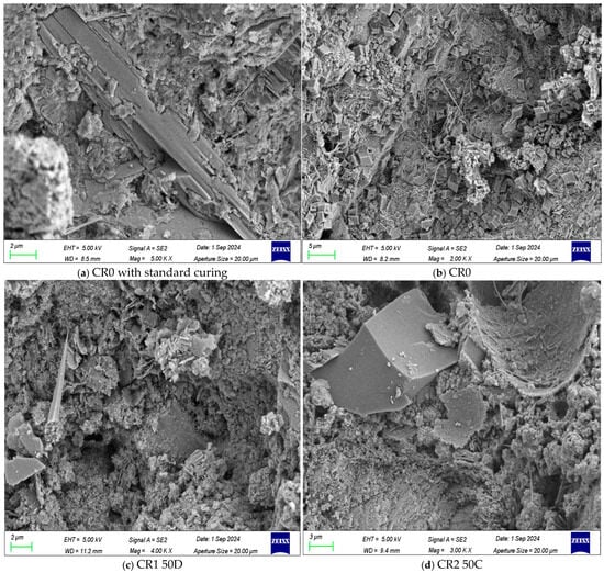 As can be seen from Figure 12a, the microstructure of hydration products was clearly visible, especially needle-like ettringite, plate-like and layered calcium hydroxide, fibrous hydrated calcium silicate, and a small amount of micropores. After carbonation curing for 28 days, the micromorphology of the calcium hydroxide in the mortar disappeared obviously, and the fibrous calcium silicate hydrate also decreased. Meanwhile, the quantity of cubic calcium carbonate increased significantly. This also shows, once again, that carbonization is beneficial to the transformation of calcium hydroxide into calcium carbonate and the enhancement of its compactness, so it is beneficial to the improvement of mechanical properties and durability of mortar. After adding calcium carbide slag and sintered red mud, even under carbonation curing, the microstructure of mortar was still dominated by needle-like ettringite, layered calcium hydroxide, and fibrous hydrated calcium silicate, with a small amount of cubic calcium carbonate and micropores. In addition, it was found that the addition of calcium carbide slag was beneficial to the consumption of calcium hydroxide and the hydration product of cement, and it reduced the amount of reaction with CO2, such as CR1, where no obvious cubic calcium carbonate was detected. However, when the content of calcium carbide slag reduced to 25%, as exemplified by CR4, not only cubic calcium carbonate but also layered calcium hydroxide could be observed, which provided the possibility for carbonization reaction in mortar matrix. Analogously, layered calcium hydroxide, fibrous calcium silicate hydrate, and cubic calcium carbonate could still be seen when 33.4% sintered red mud and calcium carbide slag were mixed. However, when the compound dosage was 50%, the kind of hydration products did not change, but the compactness was obviously improved. From the above, it can be seen that adjusting the proportion and dosage of admixture types is beneficial to improving the compactness of the mortar matrix and the content of hydration products.