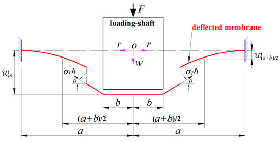 As shown in Figure 2, a cylindrical coordinate system (r, φ, w) is introduced, where r is the radial coordinate variable, φ is the angle coordinate variable (not represented in Figure 1 due to the rotational symmetry), w is the cylindrical coordinate variable (w also represents the membrane deflection), a represents the radius of the initially flat, peripherally fixed circular membrane with Young’s modulus of elasticity E, Poisson’s ratio v and thickness h, b represents the radius of the cylindrical loading shaft (a cylindrical punch), F represents the external load applied to the loading shaft (the spring force F = kx(L − wm) in Figure 1b), w(a+b)/2 represents the membrane deflection at r = (a + b)/2, wm represents the maximum membrane deflection at r = b, the polar plane (r, φ) passes through the geometric middle plane (the dash–dotted line in Figure 2) of the exposed initially flat, suspended thin film (see Figure 1a), and the coordinate origin o of the introduced cylindrical coordinate system (r, φ, w) coincides with the centroid of the geometric middle plane. This large deflection problem of axisymmetric deformation of the initially flat, peripherally fixed circular membrane subjected to the action of a uniformly distributed axisymmetric line loads is divided into the large deflection problem within b ≤ r ≤ a and the radial horizontal stretching problem within 0 ≤ r ≤ b, and it is analytically solved as follows.