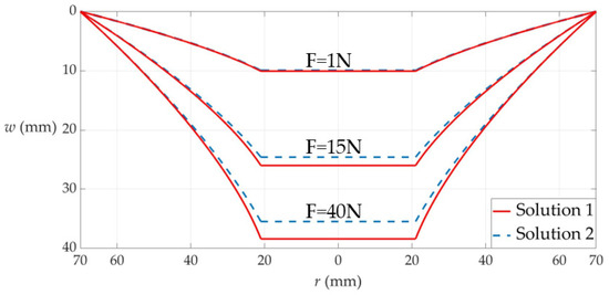 Therefore, for a concrete problem in which the values of the parameter variables a, b, h, E, ν, and F are known beforehand, the undetermined constants b0, c0, and d0 can be determined by Equations (50)–(52), all the coefficients bi, ci, and di (i = 1, 2, 3,…) can be determined, and all the expressions of Sr(x), St(x) and W(x) can also be determined. The large deflection problem within b ≤ r ≤ a can thus be solved analytically. Further, with the known Sr(x) or St(x), uB can be determined by Equation (38) or (39), the radial horizontal stretching problem within 0 ≤ r ≤ b can thus be solved analytically. The large deflection problem of axisymmetric deformation of the initially flat, peripherally fixed circular membrane subjected to the action of uniformly distributed axisymmetric line loads (i.e., the action of the cylindrical loading shaft in Figure 1) is thus solved analytically.