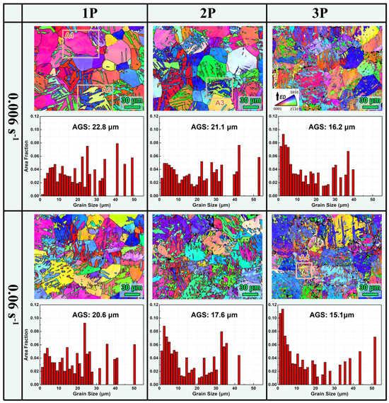 Figure 3 shows the IPF coloring maps and corresponding grain size distribution maps for samples processed at room temperature MDF with different parameters. At room temperature deformation, thermally activated processes involving dislocation rearrangement are significantly suppressed, leading to greatly reduced dynamic recovery and dynamic recrystallization (DRX) capabilities of the metal. Therefore, the activation of tensile twinning may become the primary deformation mechanism, refining the grain structure. Post-MDF deformation, the initial equiaxed grain structure was largely replaced by a twin structure with multi-scale interactions, which closely resemble {102} tensile twins. At the same strain rate, the density of twins increased significantly with the number of forging passes, and the grain size was notably refined. At the same number of forging passes, samples subjected to a higher strain rate exhibited higher twin density, indicating that an increased strain rate favors grain refinement. The grain refinement effect was more pronounced during the first two passes and diminished during the third pass, possibly suggesting that the stress required for twin nucleation increased with the grain refinement [14]. Compared to larger grain sizes in the initial state (AGS of ~60 μm), the AGS for the samples processed at a low strain rate (Group 1) decreased to 22.8 μm for one pass, 21.1 μm for two passes, and 16.2 μm for three passes. For Group 2, the AGS decreased to 20.6 μm for one pass, 17.6 μm for two passes, and 15.1 μm for three passes. Despite the grain size differences narrowing after three passes, the grain size distribution within 0–10 μm is higher in Group 2 with a higher strain rate, indicating more thorough refinement.