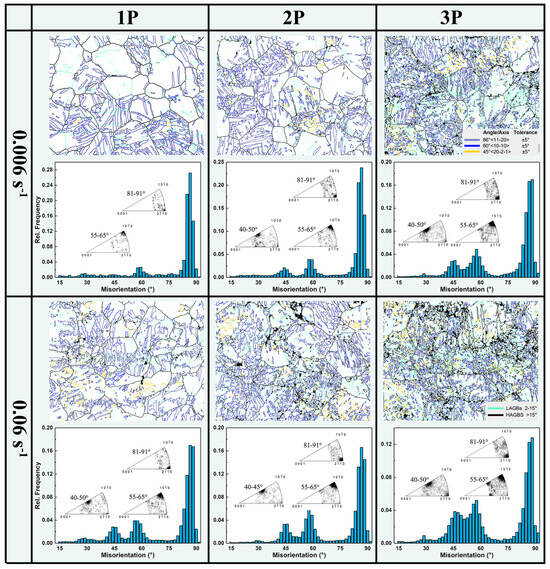 Figure 4 shows the grain boundary (GB) characteristics and the corresponding misorientation angle distribution (θ > 15°) of the MDF samples at room temperature. After MDF, the GB characteristics exhibit three distinct preferential distributions, with major peaks at ~45°, ~60°, and ~86°. The inserted GB rotation axis distribution indicates that the 45° peak corresponds to enrichment of the <201> axis, the 60° peak to the <100> axis enrichment, and the 86° peak to the <110> axis enrichment. It is well known that the activation of {102} tensile twins in Mg resulted in an 86° <110> orientation relationship between the matrix and the twinned regions, while interactions between tensile twin variants contributed to the formation of the 60° <100> GB [15]. This clearly indicates that twinning and twin variant activation were the dominant deformation mechanisms during room temperature MDF. Additionally, a new 45° <201> orientation relationship also appeared frequently, which is reported to be associated with the interaction of tensile twins [16], as discussed in the next section. Comparing MDF samples with different parameters, it is evident that tensile twin boundaries (TBs) dominate the GB proportions. The relative proportion of twin variants increased with the number of forging passes, and Group 2 shows more activated tensile twin variants. Furthermore, the proportion of 45° <201> GB increased with the number of forging passes, and in Group 2 after three passes, the 45° and 60° peaks gradually merged, forming a broader preferential peak.