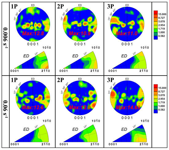 Figure 5 shows the (0001) pole figures (PFs) and IPFs of MDF samples with different parameters. Under multidirectional stress, the texture of MDF samples shows significant changes compared to the initial state. The initial fiber texture became more dispersed, with the basal plane orientation deviating up to 30° from the ED, and a new ED component appeared. In Group 1 with 1–2 passes, the ED component is stronger than in other samples. The texture intensity of Group 1 is slightly weaker than that of Group 2 at the same forging pass. Clearly, the deformation characteristics of MDF involve interactive stresses in three directions. The emergence of the ED component was closely related to twin nucleation induced by loading in the ED. Meanwhile, the loading in the TD and ND during a deformation cycle could lead to the consumption of ED components through secondary twinning or detwinning. The current results suggest that such consumption was more evident at a higher strain rate, likely due to more thorough twin activation. Overall, the texture of all samples becomes significantly dispersed, potentially weakening the anisotropy caused by basal fiber texture in an extruded state.