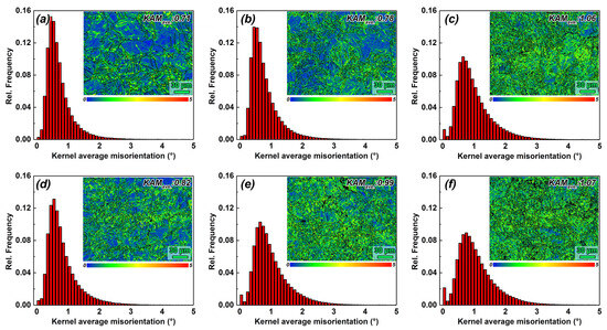 KAM maps and distribution histograms of room temperature MDF samples with different parameters. (a–c) Group 1, 0.006 s−1 and (d–f) Group 2, 0.06 s−1.