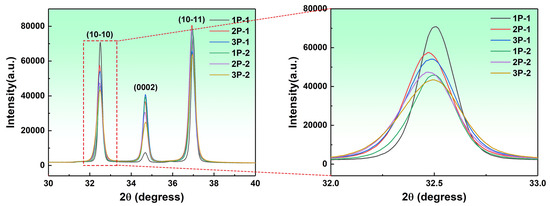 It is well known that reducing the step size in KAM calculations can enhance the accuracy of dislocation density estimation, but this is also influenced by time costs. Therefore, to further analyze the macroscopic dislocation density of the deformed samples, XRD was used to measure the changes in lattice parameters of three typical peaks of Mg for MDF samples under different parameters, as shown in Figure 7. During plastic deformation, changes in grain size and dislocation multiplication can alter the interplanar spacing, leading to variations in the diffraction peak width and position [17]. It is evident that the intense dislocation multiplication in cold deformation caused lattice distortion, resulting in fluctuations and broadening of the diffraction peaks. The dislocation density of crystals can be calculated using the Williamson–Hall (W–H) method [18]. The main formulas are as follows: