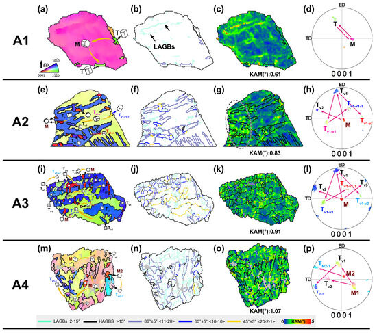 The microstructural evolution characteristics of typical grains in the A1–A4 regions of Figure 3. (a,e,i,m) IPF coloring maps, (b,f,j,n) GB maps, (c,g,k,o) KAM maps, and (d,h,l,p) discrete (0001) PFs.