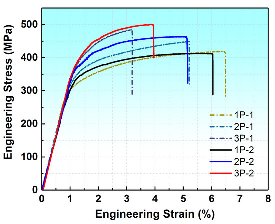 Figure 9 shows the tensile properties of MDF samples tested along the ED, with the corresponding data summarized in Table 2. It is evident that the tensile properties of all samples were significantly improved after MDF deformation, with some achieving a UTS up to 500 MPa. Notably, after the yield stage, all tensile curves exhibit normal strain hardening behavior, indicating that dislocation slip was the primary deformation mechanism during deformation. This suggests that TBs can also act as obstacles to dislocation motion, rather than merely being high migrating. It can be seen that with an increase in the number of forging passes, the tensile strengths of all samples gradually improved, while their ductility decreased. At lower passes, samples from Group 1 exhibited better ductility, with the sample 1P-1 showing the highest elongation of 6.5% but the lowest UTS of 420 MPa. However, with an increase in the number of forging passes, the ductility loss in Group 1 was greater than in Group 2. It should be noted that the samples 2P at both low and high strain rates achieved a good balance of strength and moderate ductility.
