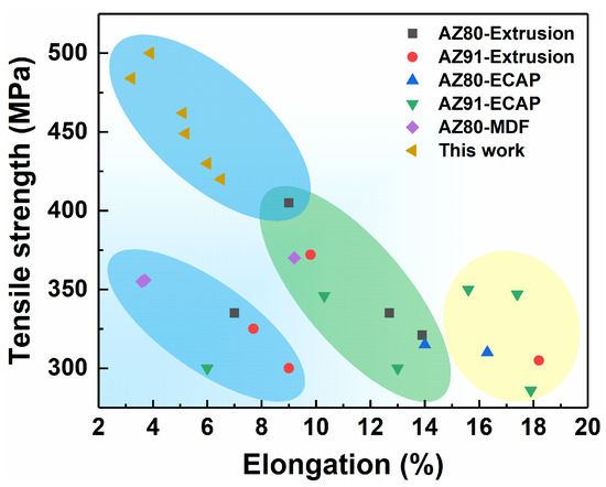 Figure 10 compares the mechanical properties of samples prepared in this study with some typical thermomechanically processed high Al content AZ series alloys. Traditionally, the tensile strength of AZ80 or AZ91 alloys rarely exceeded 400 MPa under conventional thermomechanical processing. However, after room temperature MDF, the tensile strength of AZ80 alloys in this study all exceeded 400 MPa. It is known that grain structure, texture, dislocation density, and possible precipitate phases are key factors affecting the properties of Mg alloys. In traditional thermomechanical processing, dynamic grain refinement induced by plastic deformation, texture strengthening formed under directional stress, and subsequent appropriate heat treatment are crucial for improving the properties of Mg alloys [4]. In contrast, during room temperature MDF based on twinning-coordinated deformation, grain refinement is not as significant, falling short of the grain refinement levels reported for thermomechanical processing. For instance, Kang et al. [22] reported that the AGS of an AZ91 Mg alloy could be refined to ~1 μm after extrusion at 250 °C. However, dislocation structures are maximally retained during room temperature deformation.