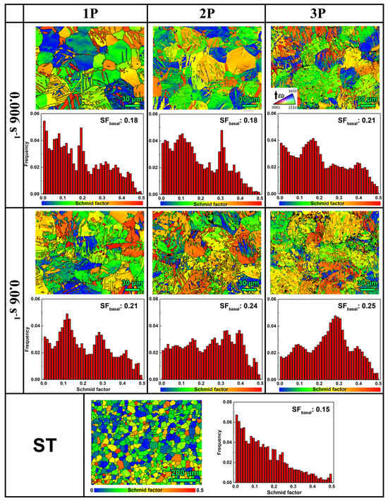 Additionally, texture is another key factor affecting the plasticity of Mg alloys [34]. Due to multidirectional loading, the strong texture state of the material was disrupted, weakening the strong basal fiber texture in the extruded state. As shown in Figure 11, the Schmid factor (SF) distributions for basal <a> slip during ED loading of MDF and ST AZ80 alloys show that the texture weakening facilitated basal <a> slip. As the number of deformation passes increased, the SF for basal <a> slip gradually increased, with Group 2 having higher average SF values than Group 1. On the one hand, as the number of deformation passes increased, the grain refinement caused by twin and twin variant subdivisions became significant, weakening single texture type and promoting relative grain orientation dispersion. On the other hand, under higher deformation passes and strain rates, TBs could deviate more from the fixed twin orientation, promoting grain orientation dispersion. The activation of basal <a> slip weakened the dominance of single prismatic <a> slip activation in the extruded state, facilitating the complementary deformation mechanism and promoting multi-slip coordinated deformation, potentially enhancing alloy plasticity.