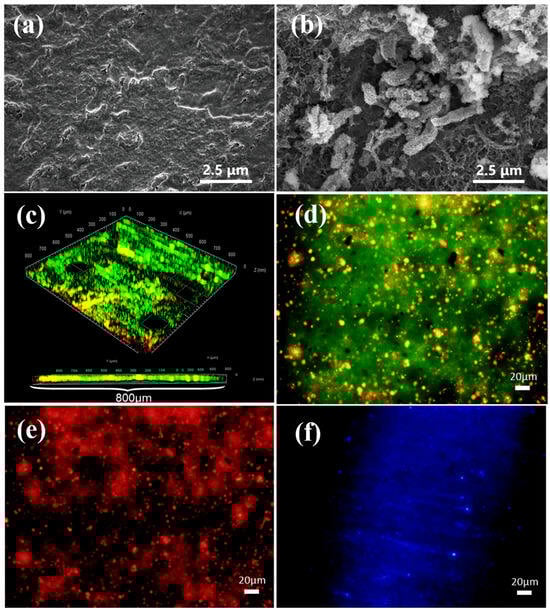 Scanning electron microscopy (SEM) micrograph images of the Q235 surface from (a) control and (b) D. bizertensis-containing medium. Confocal laser scanning microscopy images of the biofilm cells on the Q235 surface after 15 days immersion, stained with the LIVE/DEAD Biofilm Viability kit (c), and EPS distribution ((d) proteins stained with FITC, (e) polysaccharides stained with Concanavalin A-TRITC, and (f) lipids stained with Nile red). Green coloring indicates live cells, red coloring indicates dead cells, and yellow coloring indicates partially damaged/dead cells.
