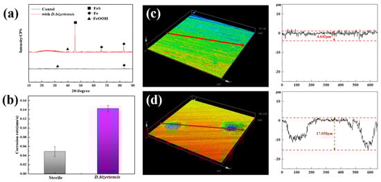 (a) XRD of surface products of Q235 steel from control and D. bizertensis-containing medium, and (b) annual corrosion rates of Q235 steel after 15 days incubation. (c,d) The pits and their depths on the Q235 steel coupons from control and D. bizertensis-inoculated media after 15 days.