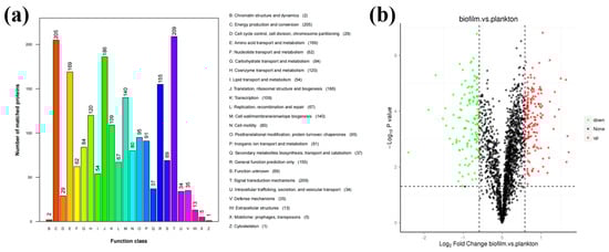 (a) Summary of detectable protein contents and functions. (b) Volcano plots representing the results of the proteome analysis in biofilm vs. planktonic cells.