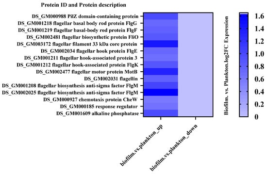 Up- and down-regulated flagellum-related DEPs in biofilm and planktonic cells.
