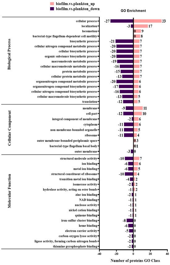 Functional category distribution of differentially expressed proteins by GO in biofilm and planktonic cells.