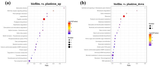 Differentially expressed proteins in KEEG pathway biofilm cells on the Q235 surface and planktonic cells, (a) biofilm.vs. plankton_up, (b) biofilm.vs.plankton_down.