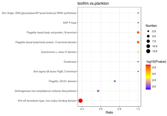 DEPs in both biofilm and planktonic cells were also examined using protein structural domain enrichment analysis, and it was found that biofilm and planktonic DEPs were mainly enriched in 4Fe-4S ferredoxin-type, iron–sulfur binding domain, flagellar basal body rod protein, N-terminal, flagellar basal-body/hook protein, C-terminal domain, dinitrogenase iron-molybdenum cofactor biosynthesis, cytochrome c, class III domain, extracellular solute-binding protein, family 3, etc., as shown in Figure 7.