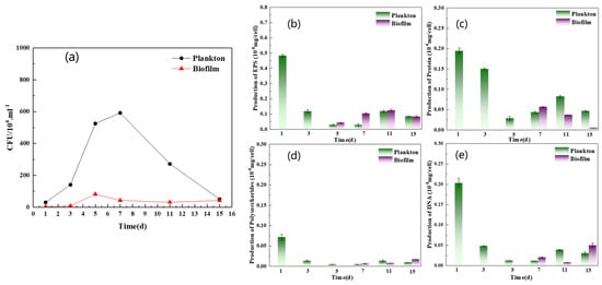 Growth curve (a) and EPS concentration of plankton cell and biofilm cell: (b) total, (c) protein, (d) polysaccharide, and (e) DNA.