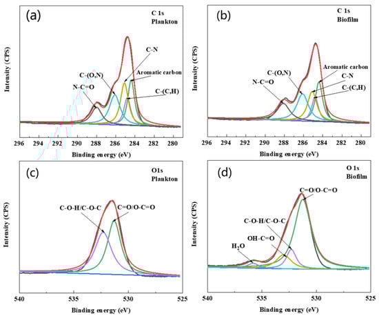 The EPS composition of biofilm on the surface of Q235 and planktonic cells is shown in Figure 8b–d. The results showed that the amount of EPS was greater in planktonic cells than in biofilm cells during the first two days. However, after two days, the amount of EPS was higher in biofilm cells than in planktonic cells. The compositional analysis revealed that proteins were predominant in the EPS of biofilm and planktonic cells over other components, and this was consistent with the results of agglutinin staining. Further, a higher content of DNA in the EPS of planktonic cells was observed during the early stage of growth. It has been reported that DNA can act as a signaling molecule to allow planktonic cells to aggregate and form a biofilm [32,33]. The cell morphology of planktonic and biofilm cells captured by SEM and fluorescence microscopy is shown in Figure S1. As shown in Figure S1, the cells were not damaged and remained active after EPS extraction using CER. XPS spectra (Figure 9a,b and Table 1) revealed that the C element of EPS in the biofilm was mainly combined with N (about 64%), and the C of aromatic hydrocarbon was 23%. In the EPS of planktonic cells, the C element was combined with N functional group and accounted for 62.2%, which was about 1.8% less than that in the EPS of biofilm, but the concentration of aromatic C increased by about 0.5%. The combination of C and N was related to the amide structure of the proteins, and the aromatic hydrocarbons are related to the metabolism of bacteria. The element O was C=O/O-C=O and it was mainly present in the amide I structure (Figure 9c,d and Table 1). The percentages of C=O/O-C=O in planktonic and biofilm cells were about 49.3% and 71.9%, respectively. Also, the amount of OH-C=O also corresponded to the hydrogen-bonding effect, which can preserve the EPS structure and biofilm stability.