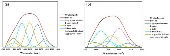 FTIR spectra of the amide I region in the EPS: (a) biofilm cells and (b) planktonic cells.