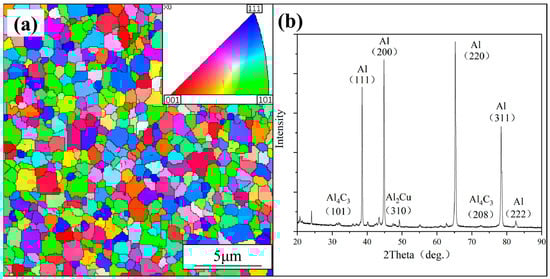 Figure 1a is the EBSD inverse pole figure map (EBSD Mira3, Czech Republic) of the original material. It shows that the primary grain size is approximately 1 μm in this plane. Figure 1b shows the XRD pattern (XRD Ultima IV, Japan) of the original material, indicating the composite consists of abundant Al phase and minor Al4C3 and Al2Cu phases. The presence of Al4C3 and Al2Cu can be attributed to the reaction between CNTs, Cu particles, and Al particles during the shift-speed ball milling [21] and sintering process [22,23]. It is worth noting that the content of CNTs is less than 1.5 wt% after the formation of the Al4C3 phase, which is below the detection limit of XRD [24]. Therefore, no carbon diffraction peaks were detected in this composite.