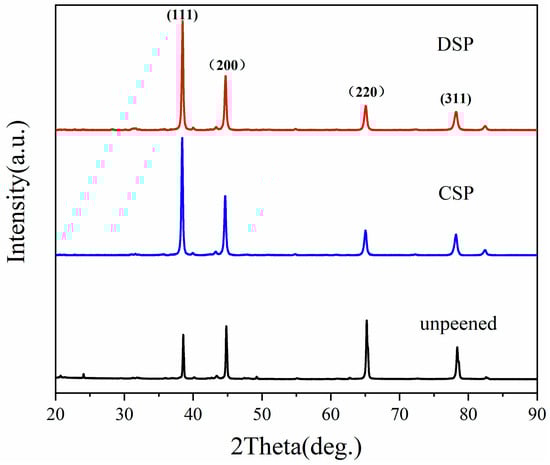 The XRD patterns at the top surface layer of the samples before and after SP are presented in Figure 4. It is observed that no new diffraction peak appears, and no phase transformation occurs in CNT/Al-Cu-Mg composites during the SP process. In parallel, SP leads to the broadening of the half-width of Al (111) diffraction peak, which is due to the grain refinement and lattice distortion. The refinement of the domain size contributes to the enhancement of the strength of the surface. Moreover, the relative intensity of each peak varies significantly before and after SP, which is due to the variation of fiber textures. During the fabrication of CNT/Al-Cu-Mg composites, there are preferred orientations along the (220) and (311) crystal plane directions. After CSP and DSP, the impact of numerous shots on the sample surface results in a large number of dislocations accumulating and more sub-grain/grain boundaries. This brings about a rotation of grain orientations and the disruption of the original texture. The disruption of the original texture improves the uniformity of the surface properties in different crystal plane orientations.