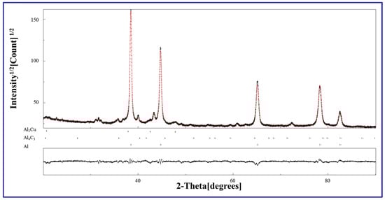 The POPA model [30] was used to elucidate the domain size and microstrain of the CNT/Al-Cu-Mg composites. The Warren model was used to modify the analysis of the displacement, broadening, and asymmetry observed in the profile due to deformation or twin faults. Using the domain size and microstrain obtained by Rietveld refinement, the dislocation densities can be quantified using the following equation: