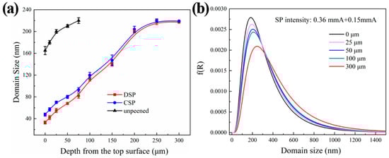 According to the Rietveld refinement method, the depth distributions of domain size are obtained. Figure 6a shows a comparison of domain size at different depths. Compared to the unpeened counterpart, domain sizes at the top surface after CSP and DSP decreased to 47.5 nm and 33.1 nm, respectively. The variation trend of domain size of the two samples is similar. As the depth increased, the domain size gradually increased and reached a stable value of approximately 220 nm after the depth reached 250 μm. The unpeened counterpart showed a slight reduction in surface domain size to 165 nm compared to the matrix, due to the introduction of slight plastic deformation during the preparation process. Nevertheless, this affected zone was shallow, with a depth of less than 100 μm. Figure 6b shows the logarithmic distribution of domain size with layer depth after DSP. The figure shows that surface deformation was most intense, and grain refinement was most pronounced. The domain size distribution range was narrow, indicating a uniform sample microstructure with the highest probability of occurrence observed at approximately 180 nm. As the layer depth increased, the domain size distribution range widened, and the maximum probability domain size value increased to 215 nm at a depth of 300 μm. The result shows that the domain size exhibited significant gradient variations with layer depth change, and the effect of DSP on reducing domain size was evident.