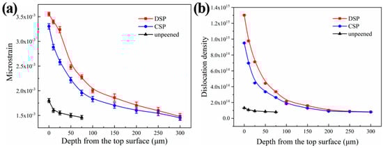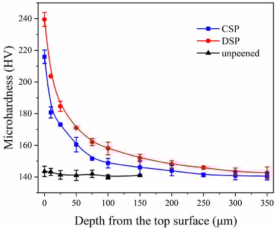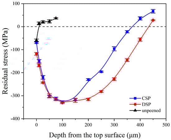Figure 11 shows the residual stress distribution at the surface layer of each sample before and after SP. It can be seen that the unpeened counterparts have a small amount of CRS on the surface of −59 MPa. As mentioned, this is introduced during the fabrication process. However, the depth of the layer affected by this stress is less than 25 μm, which is insufficient to produce a strengthening effect. After CSP and DSP treatments, a satisfactory CRS field was introduced at the deformation layer. After CSP, the magnitude of surface CRS reaches −70 MPa. This RS initially increases and then decreases with increasing depth. In particular, at a depth of 100 μm, the maximum CRS reaches −316 MPa, with a range of influence exceeding. Moreover, the affected depth exceeds 350 μm. For the DSP sample, the CRS value increases to −118 MPa at the surface and reaches a maximum value of −320 MPa at 100 μm. Compared with CSP, the maximum CRS remains nearly unchanged after DSP. This is attributed to the high SP intensity of CSP, which brings the maximum CRS close to the yield point of the original material. While the surface grain refinement and the introduction of more plastic deformation lead to the increase of surface CRS. It is worth noting that the effect of DSP on the CRS field is mainly embodied in the magnitude near the surface and the affected depth over 400 μm. In conclusion, DSP induces a higher CRS field at the sample surface, resulting in a superior strengthening effect on the surface of the material.
