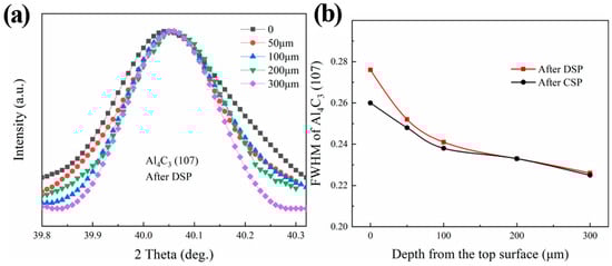 Figure 9 shows the change in full width at half maximum (FWHM) of the Al4C3 (107) diffraction peak at different depths after the DSP and CSP. The FWHM serves, to some extent, as an indicator of the corresponding domain size change. The results show a slight broadening of the FWHM of the Al4C3 (107) diffraction peak. Although the change in value is minimal, the change in the diffraction peak patterns is evident after the DSP (as shown in Figure 9a). This small change can be attributed to the fact that the Al4C3 phase is a type of hard particle with a high Young’s modulus compared to the aluminum matrix, where k = P/(−dV/V). Consequently, the Al4C3 phase presents minimal change when subjected to the same impact force. The diffraction peaks of the Al4C3 phase broadening indicate an increase in the number of crystal planes participating in coherent diffraction and alterations in the structure and distribution of the Al4C3 phase. After distorting the Al4C3 phase and experiencing a significant number of dislocation movements, the grain size is refined, and the distribution becomes more uniform, further hindering the plastic deformation of the material. As shown in Figure 9b, compared to CSP, the FWHM of the Al4C3 broadens more obviously in the surface layer after DSP, indicating more changes in the structure of Al4C3. Additionally, in addition to the direct impact at the top surface Al4C3, the subsurface Al4C3 primarily serves to transmit force within the matrix Al phase, resulting in minimal changes in the subsurface.