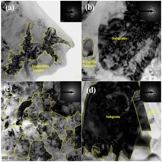 At the initial stage of plastic deformation, the atomic misalignment in the grains leads to the formation of a large number of dislocations. During the deformation process, both new dislocations are created, and existing dislocations continuously slip. The matrix material is Al with a face-centered cubic structure that has multiple slip systems. Dislocations with different slip directions interact, leading to the formation of dislocation tangles. In addition, the SAED pattern shows discontinuous diffraction spots. In regions of more severe deformation, dislocations continue to accumulate at grain boundaries and sub-grain boundaries, leading to the formation of dislocation cells. In addition, irregular extinction contours and the presence of ill-defined transition zones between grains and grain boundaries indicate the high-energy unstable nature of the microstructure and the elevated state of residual stress [37,38]. With the continuous intensification of plastic deformation, the substructure is enveloped by various dislocations and further divided into smaller subgrains and grains.