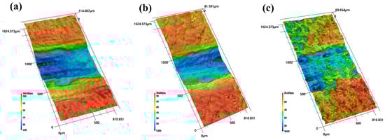 Figure 15 shows the 3D topography of the worn surfaces and clearly shows the overall changes in the depth of ridges before and after shot peening. The maximum depth of the ridges before shot peening was 108 μm, which decreased to 76 μm after CSP and further decreased to 61 μm after DSP.