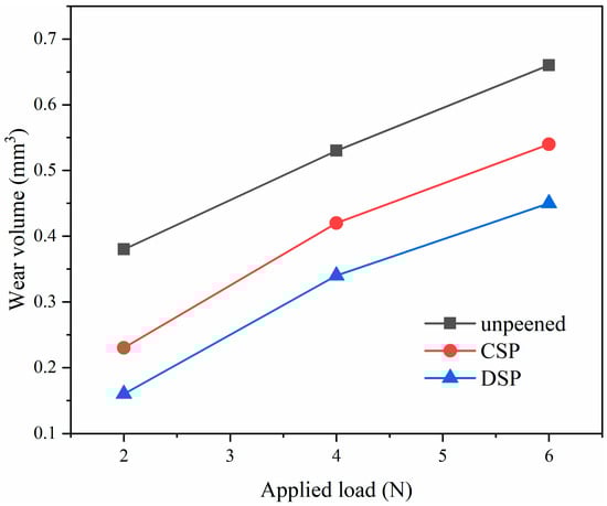 To quantify the impact of SP on wear performance, a statistical analysis of wear volumes was conducted, as depicted in Figure 16. A positive correlation was observed between the external load and the wear volume on the sample surface. Especially for unpeened samples, there is almost a linear relationship between the external load and the wear volume. Notably, CSP treatment significantly reduced the wear volume compared to unpeened samples, and DSP further diminished this volume. Specifically, at an external load of 2 N, the untreated sample exhibited a volume loss of 0.38 mm3, while CSP and DSP samples displayed volumes of 0.23 mm3 and 0.16 mm3, representing respective reductions of 39.5% and 57.9%. For 6 N, the volume loss for unpeened, CSP, and DSP is 0.66 mm3, 0.54 mm3, and 0.45 mm3, respectively, with reductions of 18.2% and 31.8% for CSP and DSP. These findings demonstrate that DSP treatment significantly enhances the wear resistance of the sample surface. The higher percentage increase in friction resistance at 2 N is due to the gradient microstructure formed by shot peening. The closer to the surface, the higher the hardness increase (as mentioned in Figure 13), and the more obvious the refinement of domain size (as mentioned in Figure 6). J.V. et al. [40] discovered that the wear rate of AA2017 alloy underwent a significant 25.8% reduction following 140 s of shot peening. Similarly, Chen et al. [41] revealed that the employment of ultrasonic shot peening (SP) resulted in a noteworthy 33.58% decrement in the wear rate of Al–Zn–Mg–Cu alloy. Furthermore, C.M. et al. [42] achieved a remarkable 44.9% reduction in the wear rate of AlSi10Mg alloy through the application of laser peening. Hence, the 57.9% reduction in wear volume observed in this study within the same timeframe is highly significant. Elucidating the underlying mechanisms of this enhancement is important.