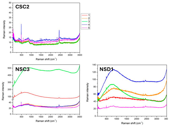 During laser texturing, the material may melt and possibly oxidize during removal. This oxidized ablated material can cause a number of surface imperfections. The formation of an oxide layer would be a negative factor reducing the strength of the adhesive bond between the substrate and the coating. In order to verify the presence of this oxide layer, Raman spectroscopy analysis was performed on selected samples (CSC2, NSC3 and NSD1).