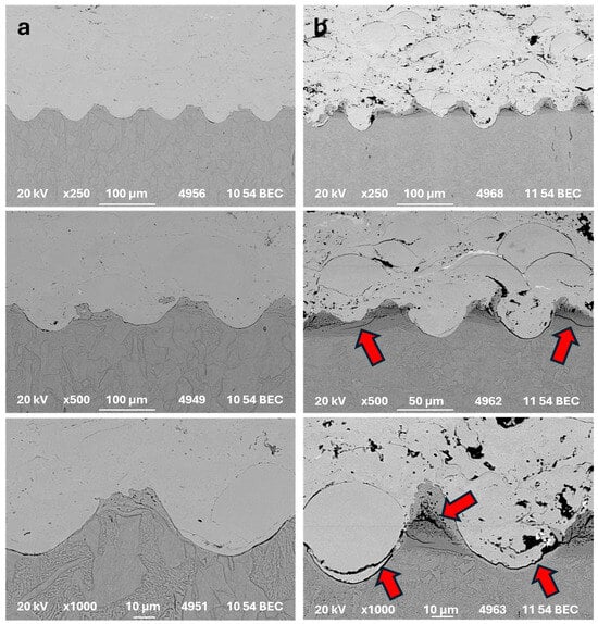 Figure 5 shows a typical microstructure of Stellite 6 alloy deposited by HVOF technology. The coating shows characteristic semi-molten splats and visible interfacial splat boundaries. From the microstructure of sample CSD1 (Figure 5a) it can be seen that the coating has completely filled all the dimples and that there is no apparent defect or crack in it. The pore content of the coating is low, which is typical for coatings deposited by HVOF technology. A cross-section of Stellite 6 coating on sample CSC2 is shown in Figure 5b. Also, in this case, the coating completely filled the texture of the grooves, and the porosity level remained low. The filling of the grooves with coating is slightly worse in the CST3 sample than in the previous two cases. This may be due to the greater depth of the textured grooves (70 µm) than in the previous two cases (40 and 30 µm).