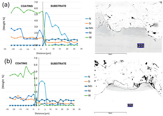 The main reason for this analysis was to determine if there was any diffusion between coating and substrate elements. The measurement showed that there is no diffusion in the content of typical elements (W for coatings and Ni or Mn for substrate); neither the N diffused to the counter material. The increase in nitrogen occurred up to the substrate area. The thin subsurface layer, containing an increased amount of N, varied between 5 and 20 µm.