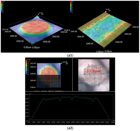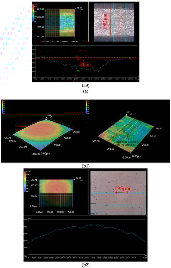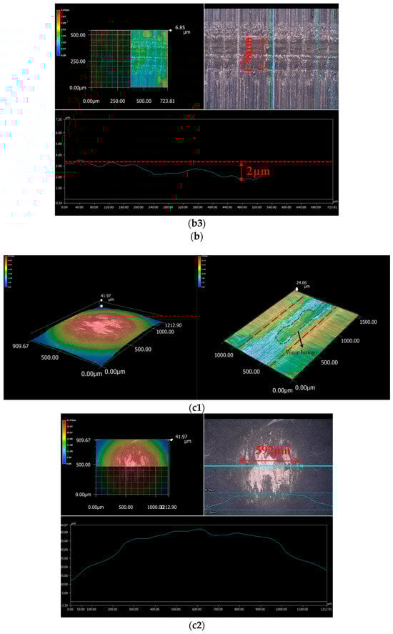 White light topography: (a) 45# pin—35CrMo block; (a1) 3D wear scar of 45# pin and 35CrMo block; (a2) 2D wear scar of 45# pin; (a3) 2D wear scar of 35CrMo block; (b) 45#-DLC pin—35CrMo block; (b1) 3D wear scar of 45#-DLC pin and 35CrMo block; (b2) 2D wear scar of 45#-DLC pin; (b3) 2D wear scar of 35CrMo block; (c) 45#-QPQ pin—35CrMo block; (c1) 3D wear scar of 45#-QPQ pin and 35CrMo block; (c2) 2D wear scar of 45#-QPQ pin; (c3) 2D wear scar of 35CrMo block.