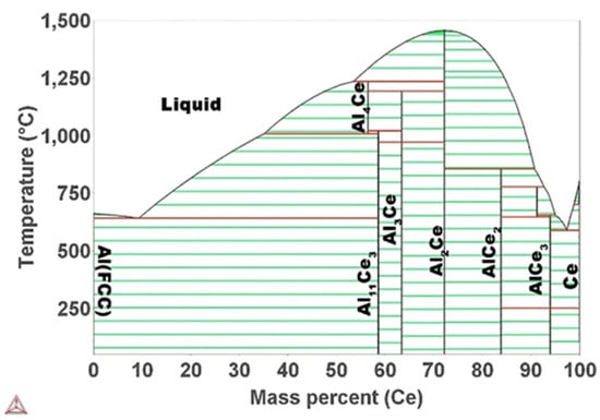 In the context of developing new aluminum alloys for AM, Ce is infrequently examined, despite the benefits previously outlined. In 2016, Sims et al. [43] conducted the preliminary investigation on the conventional cast Al-Ce alloy to assess its potential for the advancement of a new series of aluminum alloys. The findings of this study indicate that the Al-Ce binary system demonstrates a eutectic reaction characterized by a relatively narrow solidification range. For example, Plotkowski et al. [44] employed the Calphad method to compute the phase diagram for Al-Ce system (Figure 1), from which the eutectic point was estimated to be Al-10 wt.% Ce with a melting point of 640 °C. Experimental investigations have yet to reach a consensus regarding the precise eutectic point of the Al-Ce binary system. Nevertheless, the weight percentage of Ce is considered, to date, to be between 10 and 12 wt.% [33,44,45]. The eutectic microstructure of the Al-Ce system usually consists of the lamellar α-Al and Al11Ce3 intermetallic compound [46,47]. Both phase composition and microstructure morphology can have a significant impact on the mechanical properties. It is then important to study the phase composition of the Al-Ce alloy. Even though the Al-Ce binary diagram is usually useful for cast alloys, it can no longer guide the manufacturing of LPBFed Al-Ce alloys. This is because the rapid solidification during AM can lead to severe distortion of the thermodynamic phase diagram [48].