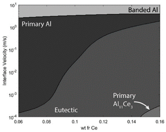 Al-Ce Microstructure selection map for composition/velocity with the thermal gradient of 106 K/m for mass diffusivities of 10−9 m2/s [49].