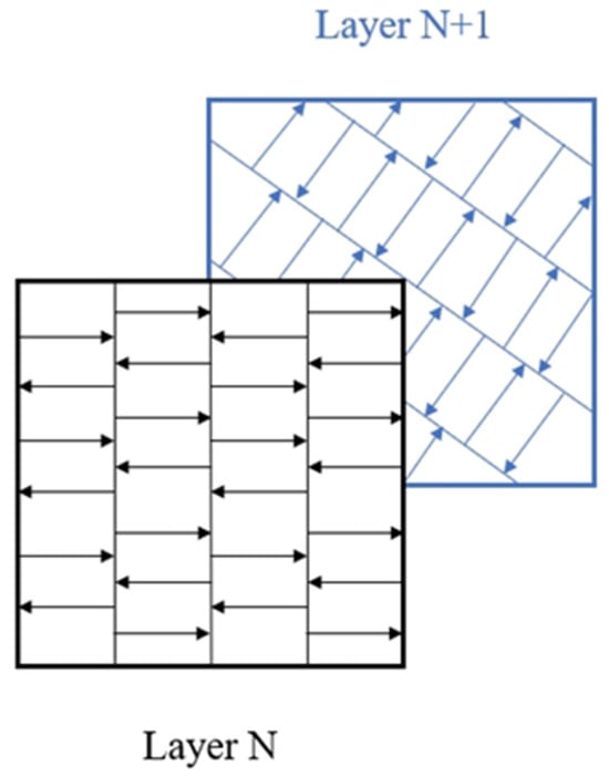 Among these parameters, h and t are often constrained by the geometry and the LPBF facility ability. Considering the practical experiment, utilizing reduced hatch spacing is recommended to mitigate the occurrence of lack of fusion (LoF) defects. Larger hatch spacing is required to eliminate the presence of multiple remelted areas during the LPBF process. Therefore, a compromised hatch space should be achieved via an experimental test. For Al-Ce alloys, the typical parameters for hatch spacing and slice thickness are, respectively, 130 μm and 30 μm, according to previous research [62,71]. Alternative hatch spacing configurations, such as 100 μm and 190 μm, may also be employed, contingent upon the specific types of as-LPBFed Al-Ce alloys utilized. Consequently, the optimization of LPBF parameters primarily emphasizes P and v. Typically, P ranges from 200 W to 400 W, while the scanning speed v varies between 100 and 3000 mm/s. Additionally, the LPBF strategy constitutes a significant variable that can influence both the microstructure and mechanical properties of alloys produced using this method [72,73]. For example, Kudzal et al. [74] conducted an investigation into six distinct scanning patterns and their effects on the microstructure and mechanical properties of 17-4 stainless steel produced via LPBF. For as-LPBFed Al-Ce alloys, the main scan strategy is stripe scanning (Figure 6). The angle of rotation between layers is typically set at 67°, which serves to prevent the accumulation of defects aligned in a singular direction. As a result, the bonding of the layers can be in a good state [75,76].
