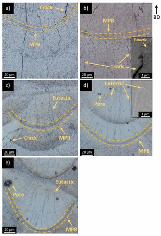 Images of melt pools for (a) Al6061-0Ce; (b) Al6061-1Ce; (c) Al6061-2Ce; (d) Al6061-3Ce; (e) Al6061-4Ce in the as-LPBFed state [81].