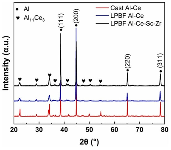 XRD patterns of the as-LPBFed Al-10Ce-0.4Sc-0.2Zr, as-LPBFed Al-10Ce, and as-cast Al-10Ce alloys [78].