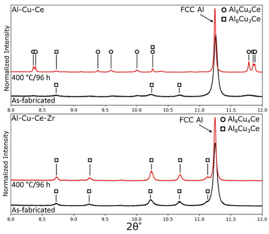 For Al-Ce alloys modified by main-alloying elements, the situation should be more complex, and the intermetallic phase may change depending on the element compositions. Bahl et al. [80] manufactured the Al-6Ce-9Cu alloys and the Al-6Ce-9Cu-1Zr alloys, and their synchrotron XRD patterns (Figure 11) were similar, which suggested that they had similar main phases. Herein, the FCC-Al (111) peak dominated in both alloys. This was unlike other typical Al-Ce-based alloys (i.e., the Al-10Ce alloy [62]), which owned two intense peaks of FCC-Al (111) and FCC-Al (200). The residual peaks correspond to the intermetallic compound present within the eutectic structure, which has been indexed to be Al8Cu3Ce. Furthermore, the Al8Cu3Ce is unstable in the Al-6Ce-9Cu alloy at 400 °C and can be partially converted into Al8Cu4Ce.