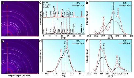The 2D synchrotron XRD patterns for the Al-9.5Ce-0.6Mg alloy in the LPBF state (a) after heat treatment of 400 °C for 1 h and (b) before heat treatment of 400 °C for 1 h; (c) integrated XRD profiles; (d–f) images for the respective positions in (c) [85].