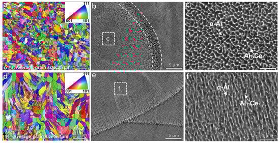EBSD images and SEM images in BSE mode of as-LPBFed Al-9.5Ce-0.6Mg (a–c) in the SD and (d–f) in the BD: (a) IPF-EBSD maps; (b) SEM image; (c) SEM image in (b); (d) IPF-EBSD maps; (e) SEM image; (f) SEM image in (e) [65].