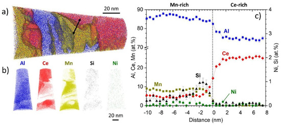 APT provides 3D atomic-level resolution, allowing for the precise identification and mapping of individual atoms within a material, and it can detect and analyze the low concentrations of phases, making it highly sensitive to the trace element. Therefore, APT analysis is usually carried out when the intermetallic phases are hard to determine. For example, Figure 16 presents a case of a reconstructed APT volume for the Al-10.5Ce-3.1Ni-1.2Mn alloy, wherein the interface of a Mn-rich precipitate and a Ce-rich precipitate was examined [101]. Five precipitate phases were predicted by thermodynamic calculations: Al11Ce3, Al10Mn2Ce, Al20Mn2Ce, Al23Ni6Ce4, and Al3Ni. The first four phases were well matched with the APT results. It was also mentioned that these precipitates exhibited incoherence with the Al matrix and were of a size that rendered them unsuitable for shearing. Therefore, the precise chemical compositions were not stressed in the following section on the mechanical properties.
