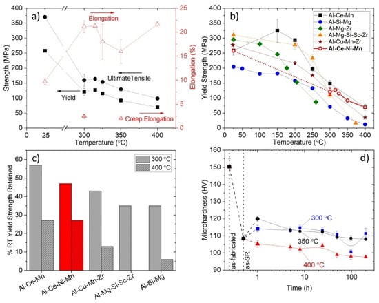 Al-10.5Ce-3.1Ni-1.2Mn alloy in the LPBF state: (a) YS, UTS, TEL, and CEL at different temperatures; (b) YS compared with other Al alloys at different temperatures; (c) retention of YS under an RT environment as a percentage in (b); (d) evolution of microhardness under an RT environment in the process of aging at different temperatures [101].