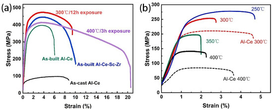 Furthermore, both main-alloying and micro-alloying strategies can be combined as a mixed strategy. Ekaputra et al. [112] manufactured the precipitation strengthened Al-7Ce-10Mg-0.71Zr-0.23Sc alloy. Apart from Mg as the main-alloying element and Sc/Zr as micro-alloying elements, there are also many other elements serving as alloying elements. For instance, Perrin et al. [113] studied the as-LPBFed Al-5.91Ce-8.80Cu-0.10Si-0.07Fe and Al-4.73Ce-7.78Cu-0.07Si-0.11Fe alloys, using Cu as the main-alloying element and Si and Fe as micro-alloying elements. However, the mechanical properties were not mentioned in this research and are still to be studied in further research. In conclusion, both main-alloying and micro-alloying methods can improve the performance of as-LPBFed Al-Ce alloys in terms of strength in RT, mainly through strengthening effects of the solid solution and precipitate, respectively.