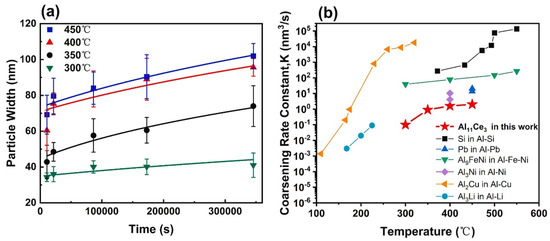 For instance, the as-LPBFed Al-10.5Ce-3.1Ni-1.2Mn alloy was studied recently [101]. In Figure 17a, the creep tests were performed in the as-LPBFed Al-10.5Ce-3.1Ni-1.2Mn alloy. In the conditions of creep load, the coarsened precipitates were observed to exhibit signs of increasement and gradually became quantifiable at temperatures equal to or exceeding 350 °C. In the case of the as-LPBFed Al-10.5Ce-3.1Ni-1.2Mn alloy, it is notable that the Mn element is identified as the solute with the slowest diffusion rate in this alloy. Considering a specific anticipated diffusion distance for Mn, the precipitate size measured in the condition of creep load was found to be bigger, indicating an enhancement in solute diffusion. This finding is consistent with the observations made in the rapidly solidified and consolidated Al-8.8Fe-3.7Ce alloy [116], which exhibits a microstructure analogous to that of the as-LPBFed Al-10.5Ce-3.1Ni-1.2Mn alloy.