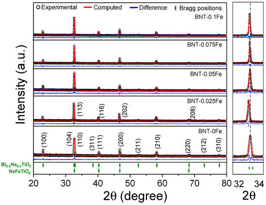 In this context, concerning the main phase, the BNT consistently maintains its rhombohedral R3c structure across all compositions. This suggests that the partial substitution of Fe3+ does not significantly alter the overall symmetry of the crystal lattice, ruling out the possibility of phase transformations. Nevertheless, the structural defects induced by the Fe3+ are sufficient for the diffraction peaks to exhibit a perceptible shift as the iron concentration increases, revealing a displacement toward low angles with respect to 2θ. The observed behavior is attributed to the substitution of Ti4+ by Fe3+ ions, resulting in an expansion of the unit cell due to the larger ionic radius of Fe3+ (0.64 Å) compared to Ti4+ (60 Å) along with the ionic charge, a phenomenon explained by Bragg’s law as shown in Equation (3):