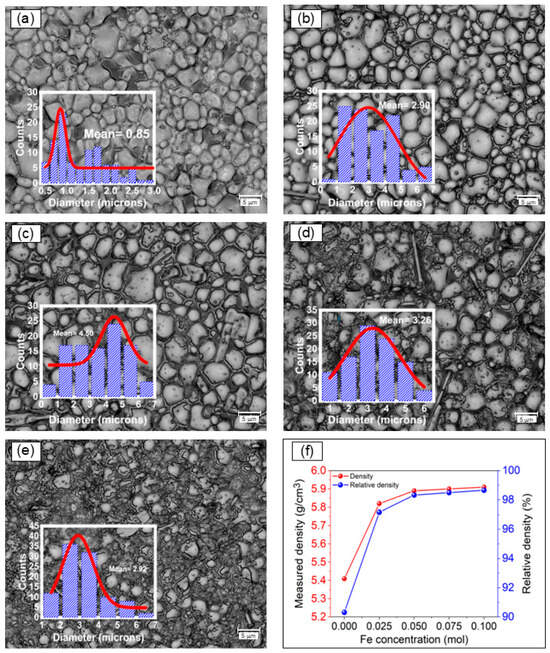 Digital-optical micrographs of pellets obtained from mixtures of Bi2O3, Fe2O3, Na2CO3, and TiO2 milled for 5 h and sintered at 900 °C for obtaining Bi0.5Na0.5Ti1−xFexO3−0.5x with x of: (a) x = 0, (b) x = 0.025, (c) x = 0.05, (d) x = 0.075 and (e) x = 0.1, (f) Densities of the BNT-xFe samples.