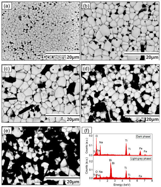 Scanning electronic micrographs of pellets obtained from mixtures of Bi2O3, Fe2O3, Na2CO3, and TiO2 milled for 5 h and sintered at 900 °C for obtaining Bi0.5Na0.5Ti1−xFexO3−0.5x with x of: (a) x = 0, (b) x = 0.025, (c) x = 0.05, (d) x = 0.075, (e) x = 0.1 and (f) EDS analysis of two distinct regions or phases.